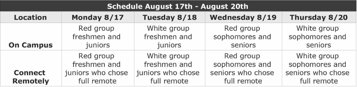 We have received a few questions about who is expected to be on campus and when. As a reminder, EVERY student, whether he or she selected remote learning or hybrid attendance, has been assigned to a hybrid attendance grouping (Red Group or White Group). HOWEVER, if a student has opted for remote learning, he or she DOES NOT need to come to campus next week; instead, he or she DOES need to connect remotely on the appropriate day based on grade level and hybrid attendance group (more information on connections in a later section of this message). All students who have opted for hybrid attendance are expected to come to campus on the appropriate day based on grade level and hybrid attendance group.