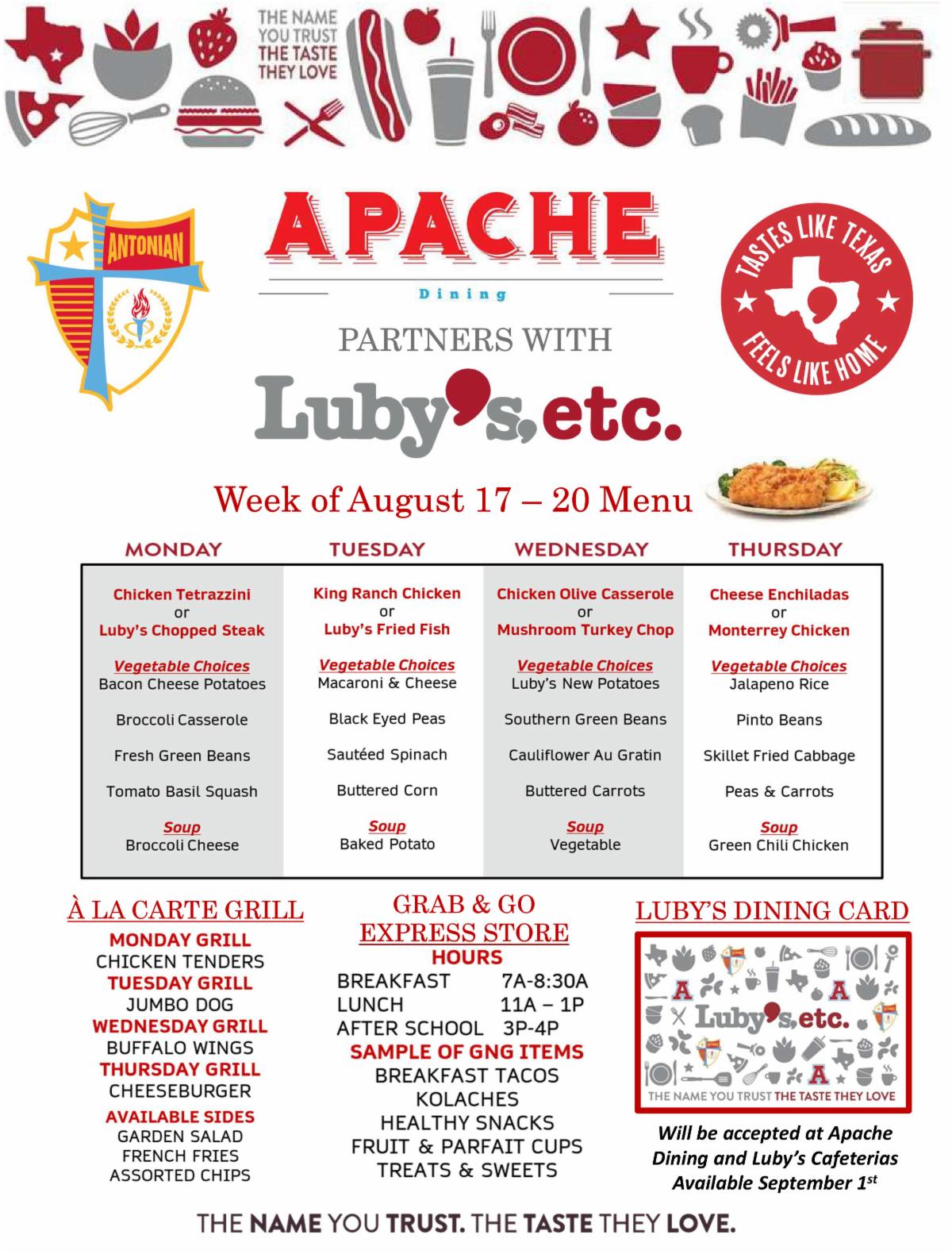Our Food Services Committee, composed of several administrators and student leaders, is excited to announce that Luby's Culinary Services will join our Antonian family this year! We are hopeful the expanded offerings with a variety of fan favorites and healthy options will be welcomed by our students and staff. There are plans to introduce up to 3 meals deals once we are able to increase our student population on campus. This year will be like no other, but we are committed to building a successful and valuable partnership.