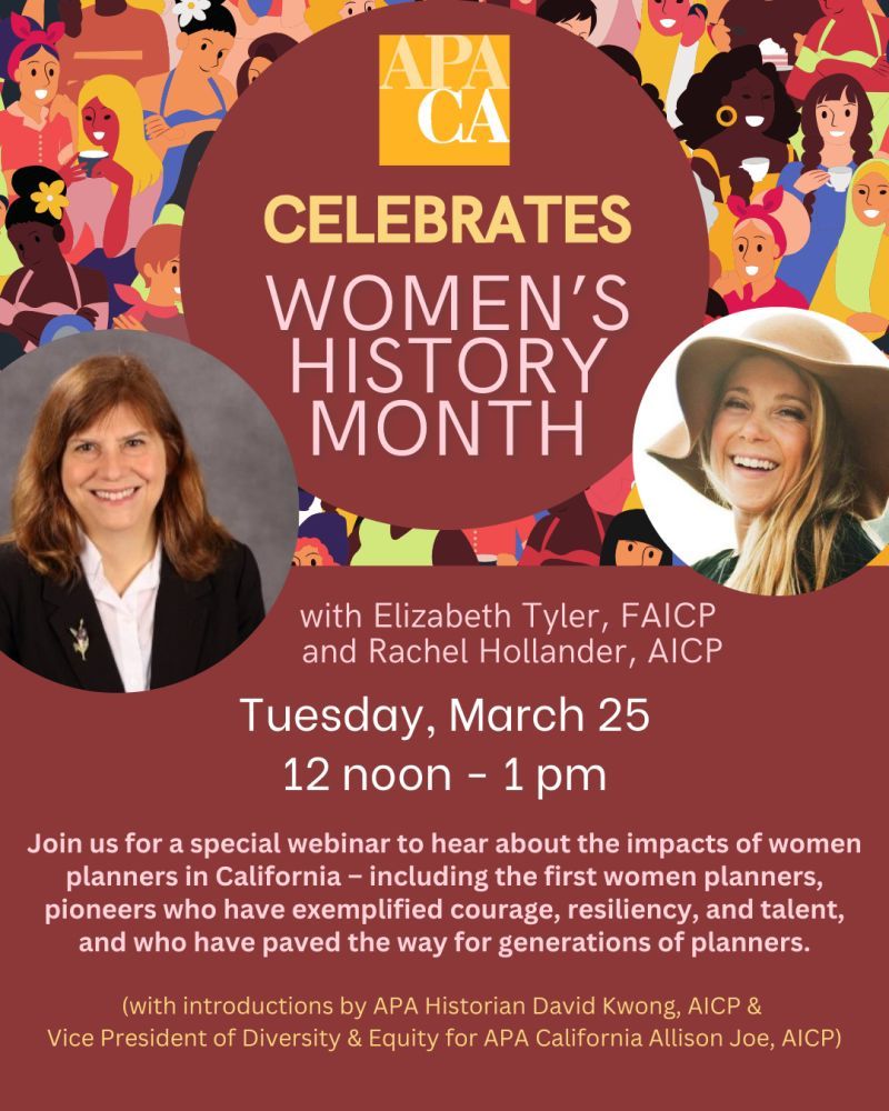 APA California - Northern Director Elizabeth Tyler, Ph.D., FAICP, celebrates Women's History Month with a webinar about how women have influenced planning. Be inspired by this lunchtime conversation with great leaders!