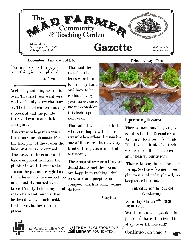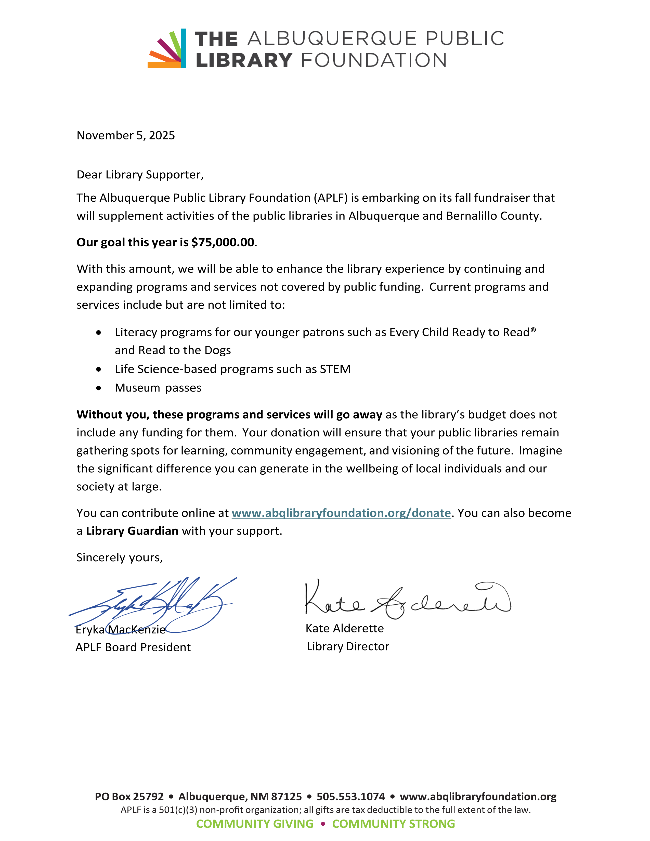 Lastly, I would like to thank each and everyone one of you for supporting APLF. But of course, our work isn't done. We are aware that there are many issues in our community that are asking for your support. However, we at APLF believe that the power of the library to bring resources, education, and community to all is crucial. When doing your end of year giving, please ensure APLF is on your list so we can continue to support library programs throughout Albuquerque and Bernalillo County.