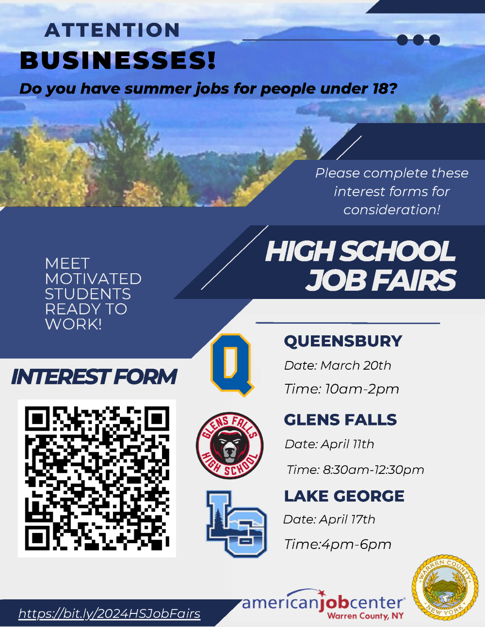 Liza Ochsendorf, Warren County Director of Workforce Development, said: “Our high school job fairs have been very successful helping local businesses get a head start on their summer hiring. We have been able to work with hundreds of students to help them find employment while assisting local businesses with the ongoing workforce shortages. Please let us know as soon as possible if your business would like to be part of one or more of these hiring events.”