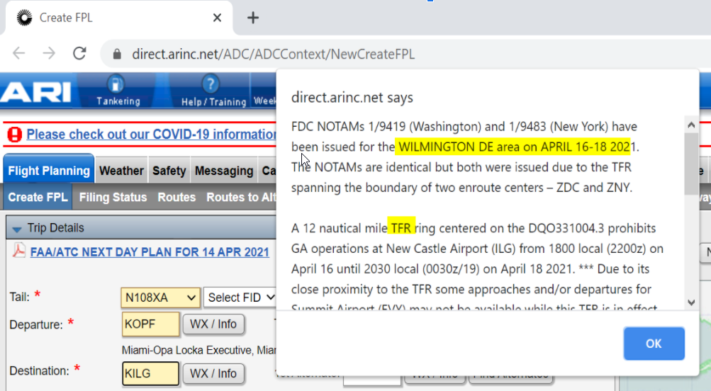 To ensure that you are prepared for upcoming TFRs, ARINCDirect provides airport alerts. When an airport that is included in a TFR is selected on the flight planning page, a pop-up will alert the planner about the restriction. Another helpful resource is the ATC Next Day Plan that is available at the top of the flight planning page. Utilizing both of these tools will allow you to be better prepared.