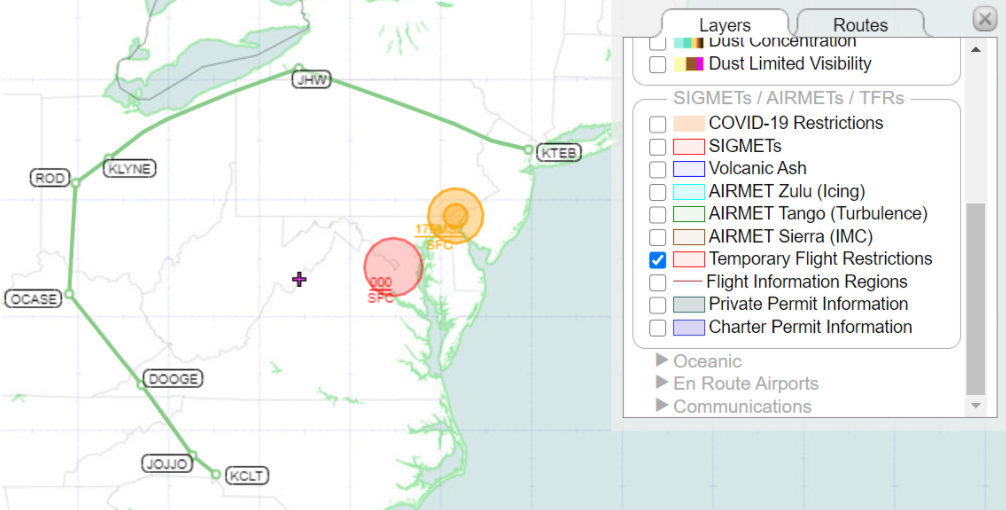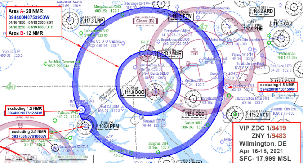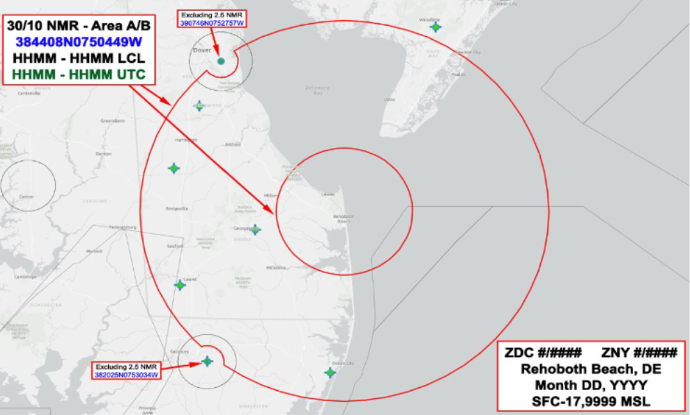 As a result, flights that take these vectors into KTEB, KMMU, and KCDW airports should be prepared: arrivals from the south and southwest over ROD or JHW, arrivals from the south over BIGEO via ZDC, and offshore arrivals from Florida via OZENA. Other flights that are impacted include arrivals into KHPN from the west and south, flights between the Philadelphia area to Washington Center (ZDC), and flights departing Washington Center to Boston Center (ZBW) or onward to the North Atlantic. Similar reroutes throughout Washington Center are issued during the Rehoboth Beach TFR.