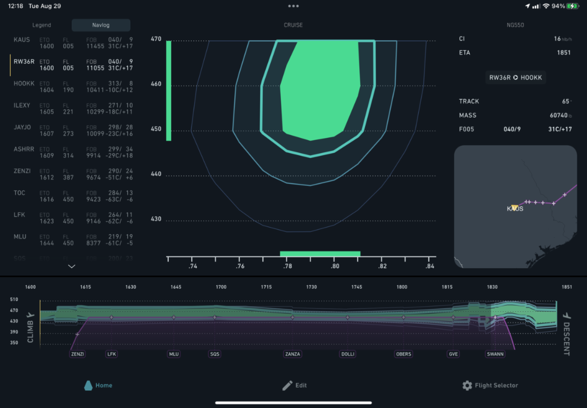 The Loretta app is an adjunct to ARINCDirect flight planning and is designed to be used close to flight time to recommend altitude and Mach-speed changes that may reduce fuel burn and/or give an earlier arrival time. Plus, if your flight is likely to generate harmful contrails, you’ll be able to see where a minimal altitude change can avoid them. Recall that around 2% of flights examined generate about 80% of the harmful contrails.