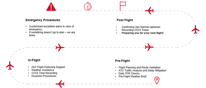 The Flight Following team is staffed 24/7 by a diverse group of professionals, including pilots, dispatchers, air traffic controllers, and meteorologists. By leveraging their extensive knowledge and years of industry experience, the Flight Following team excels in flight planning and international route validation. They provide proactive global mission support for all pre-flight, en route, and post-flight activities.