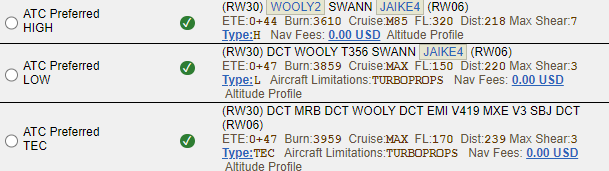 If a published route is available, ARINCDirect will display those as ATC Preferred along with additional information such as if the route is high level (H) or low level (L) or if the route is for Turboprops. Below you can see the routes presented on the flight planning page and how the FAA’s site displays them:
