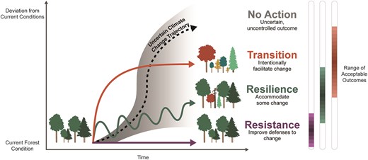 Conceptual diagram of the resistance–resilience–transition framework applied to the ASCC Network, positioned vertically along a spectrum of ecological persistence to change (i.e., adaptation). The y-axis presents the degree of alignment with current conditions relative to the future range of acceptable outcomes (i.e., desired future conditions). Graphic: Kailey Marcinkowski.