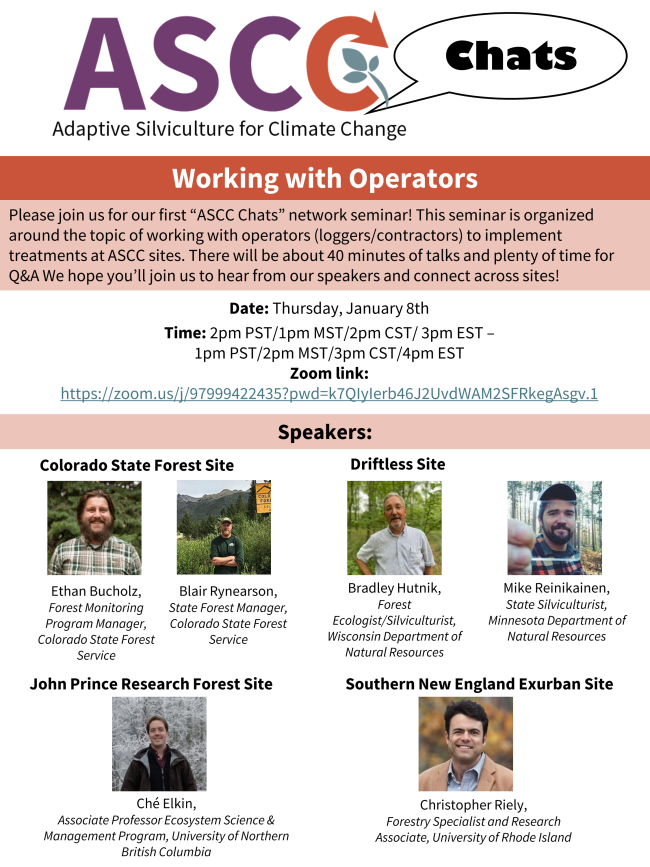 ASCC at SAF: In October, we hosted an ASCC Network Panel at the Society of American Foresters National Convention (SAF) in Hartford, CT, titled: Creating Forests for the Future through Climate-Adaptive Management. The panel was moderated by Maria Vicini, with speakers including Joshua Puhlick, Kristen Waring, Pete Clark, and Christopher Riely. The panel discussion provided lessons learned from implementing climate-adaptive forest management practices utilizing the Adaptive Silviculture for Climate Change framework. Speakers highlighted examples of regionally-specific management strategies intended to promote long-term forest adaptation while balancing multiple-use objectives.