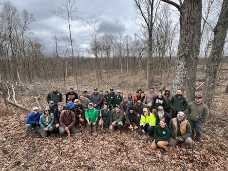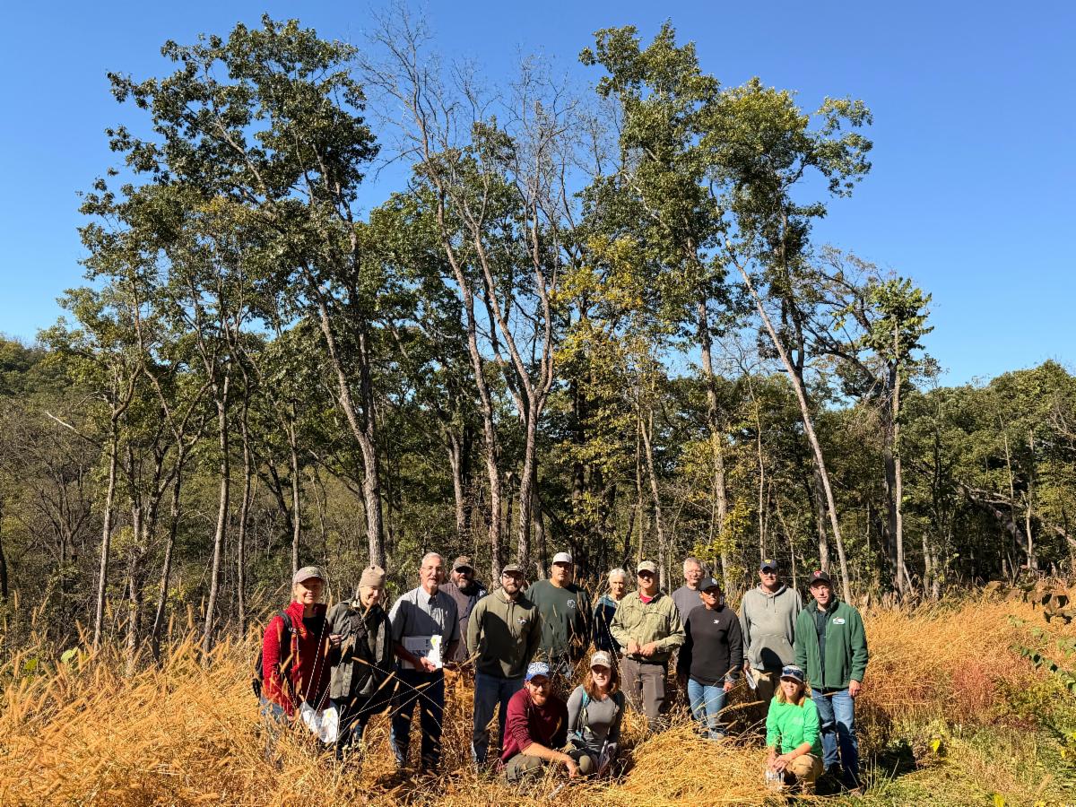 Photo caption: A site visit to the Driftless ASCC block located at the Hallock Demonstration Forest in Millville, Wisconsin, showing attendees of the October 10 tour: staff with the Ho Chunk Nation Department of Natural Resources, members of the Lower Wisconsin Riverway Board, a local reporter from the Independent Scout, and area foresters and wildlife biologists.