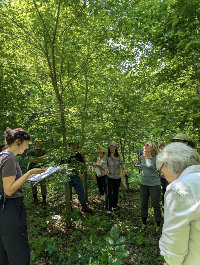 In July 2025, Crosby Farm ASCC hosted a tour of the plots for volunteers to celebrate the start of the 6th year of the experiment and to share 5-year results. Some of the tour attendees were part of the original planting and watering crews. Catherine Glenn-Stone (pictured) and Nick Parrott presented their graduate research that they successfully defended in the spring/summer of 2025.