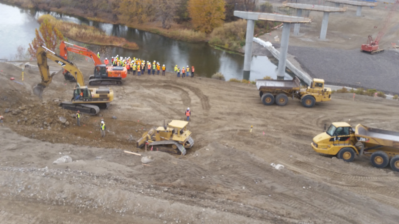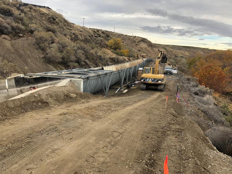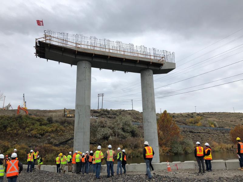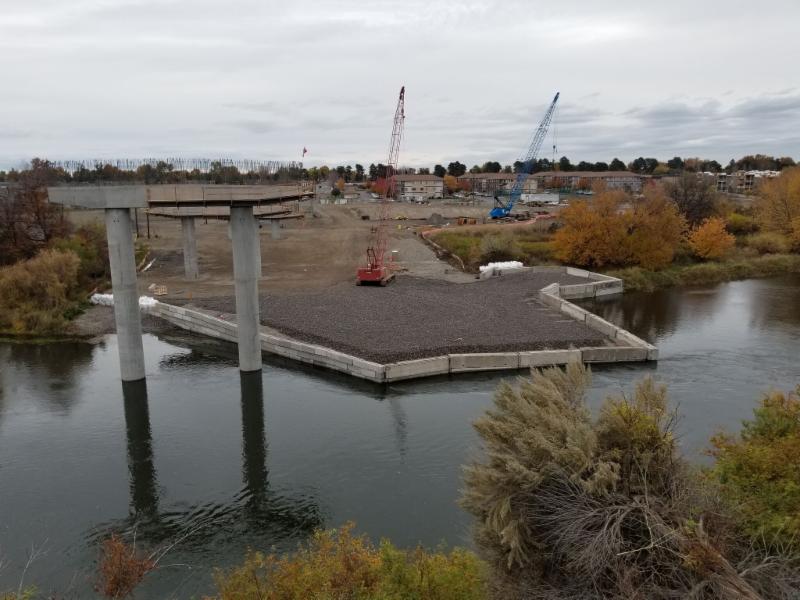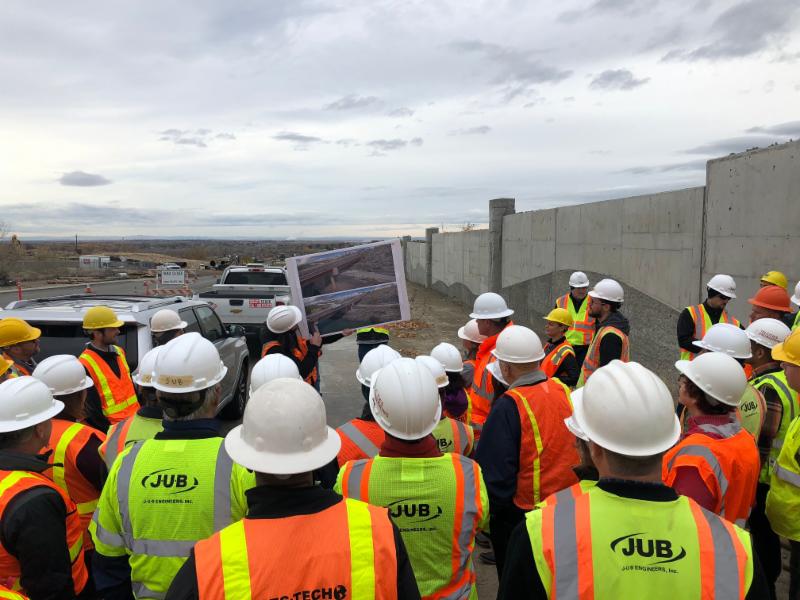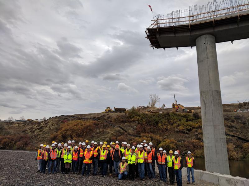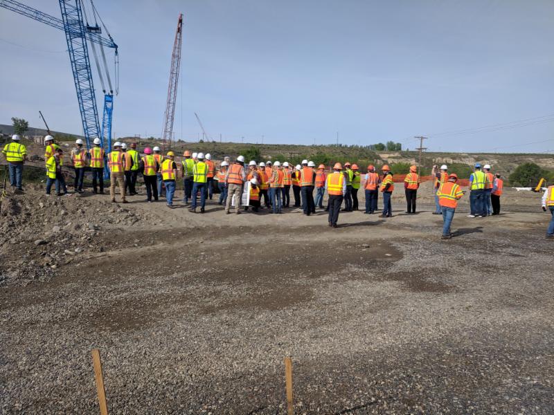 In October 2018, the City of Richland and Apollo, Inc., provided our members with an opportunity to tour the Duportail Bridge construction site. The project includes construction of a 770 foot long bridge over the Yakima River, sound walls, roadways, signalized intersections, water main (from 8" to 42" including 24" pipes on the bridge), sewer lift station, and CID canal reconstruction. We saw the sound walls, in-water work berm, bridge piers, roadway subgrade, the partially completed sewer lift station, and preparations for the CID canal replacement were underway including excavation and demolition of the existing steel flume in preparation for construction of a concrete canal.