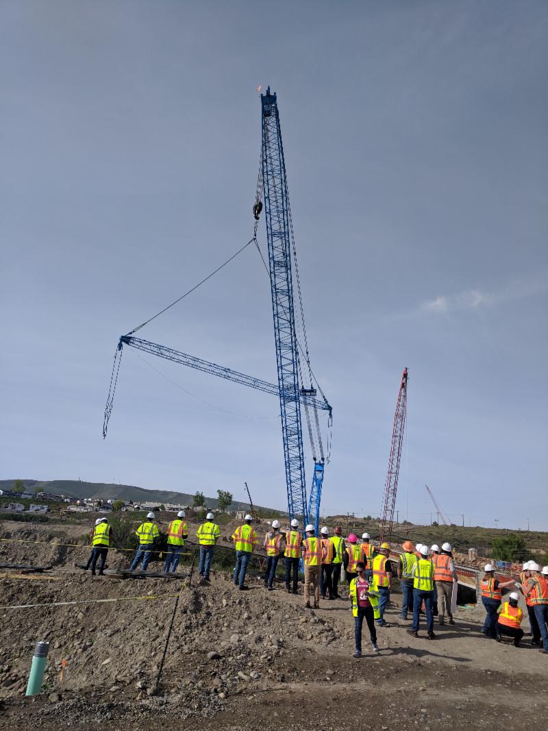 In April 2019, we returned to the Duportail Bridge project site to see the progress of the girder set which incorporated the use of a Lampson Transi-Lift LTL-1100 with 380’ of boom and 1,600,000 lbs of counterweight. Thanks to Andrey Avetisyan with the City of Richland and to Apollo for accommodating our group of nearly 60 people on the construction site. On the morning of the tour, the City learned that the girders had not been delivered the night before, so we were not able to watch the placement of a girder. However, due to the fact that the crane was not active, this allowed us to see it up close.