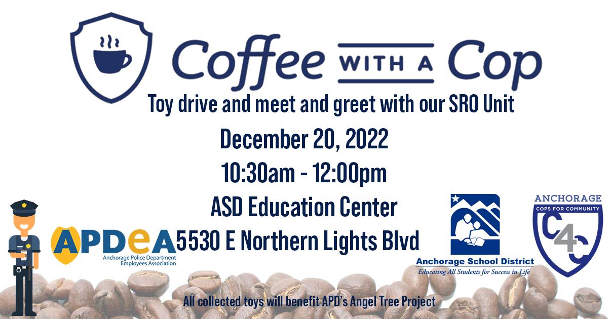 Join the Anchorage Police Department's School Resource Officer (SRO) Unit for Coffee with a Cop Tuesday, Dec. 20 from 10:30 a.m. to noon at the ASD Education Center, located at 5530 E. Northern Lights Blvd. This event is open to the community.