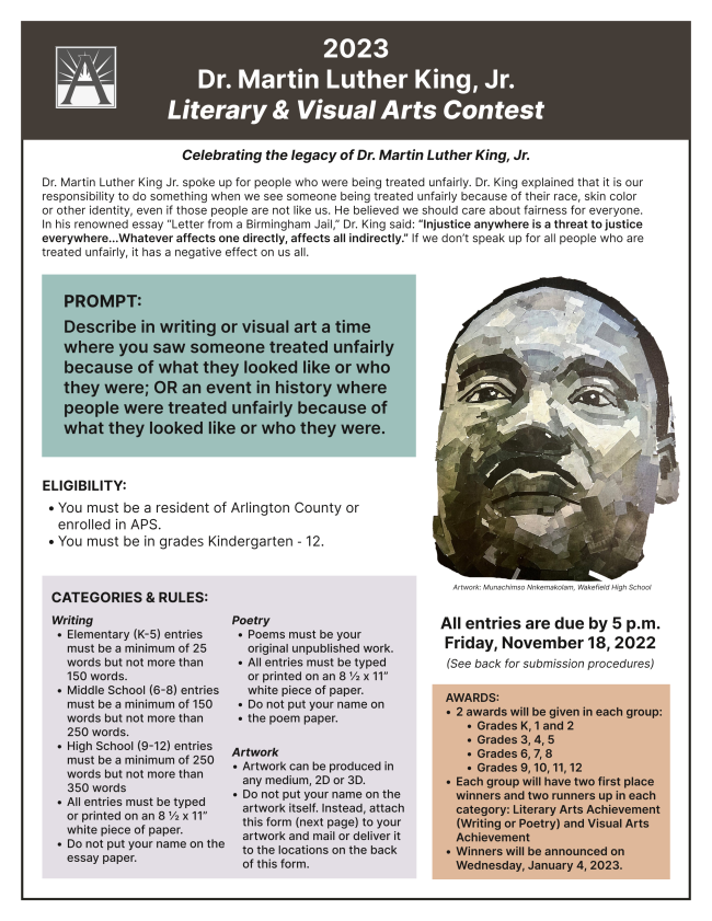 All students K-12 are eligible to enter the MLK Literary and Visual Arts Contest. For more information, please review the linked flier. Entries are due November 6th.