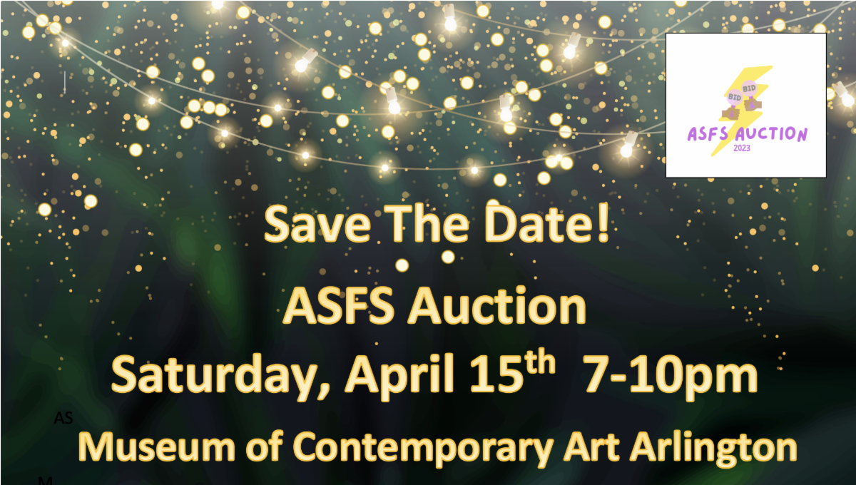The ASFS Auction will be Saturday, April 15th from 7-10pm at the Museum of Contemporary Art Arlington. Hope to see you there!