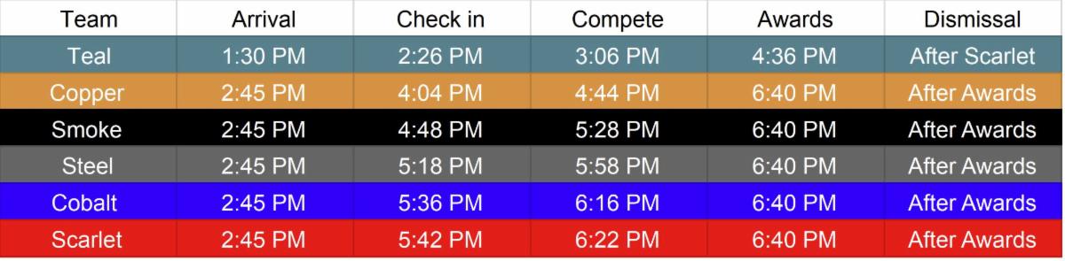 Please make sure that YOU AND YOUR ATHLETE are in the Team GroupMe's assigned to your team. THIS WILL BE THE ONLY FORM OF COMMUNICATION THAT WE WILL BE USING AT THE COMPETITION. PLEASE AVOID USING ANY OTHER FORM OF COMMUNICATION TO YOUR COACHES. Coaches will update both GroupMe's immediately with any changes, etc.