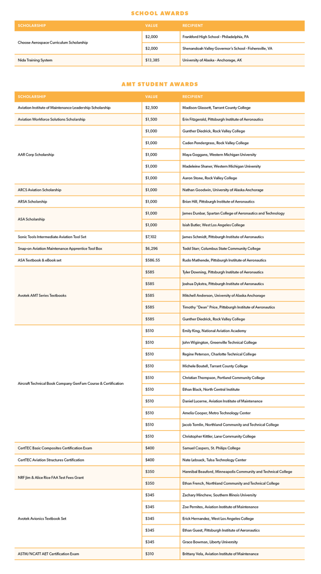 Choose Aerospace is proud to announce its slate of 2024 scholarship and award recipients. This year, a host of partner organizations sponsored over $55,000 worth of scholarships, textbooks, tool sets, training systems, and testing fee credits for educators and future aviators.