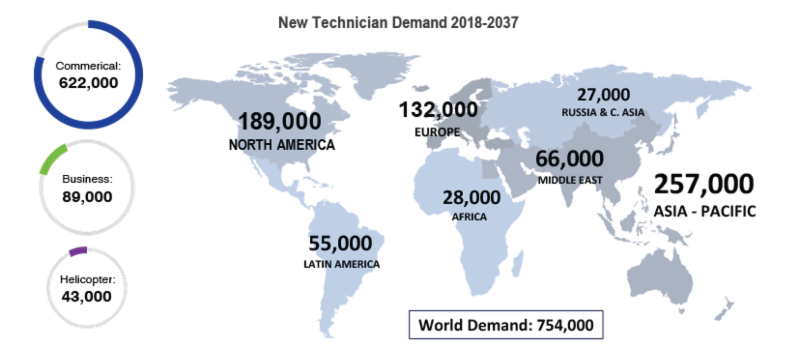Boeing estimates that the need for maintenance personnel is largest in the Asia Pacific region, which will require 257,000 new technicians. Airlines in North America will require 189,000, Europe 132,000, the Middle East 66,000, Latin America 55,000, Africa 28,000, and Russia/Central Asia 27,000.