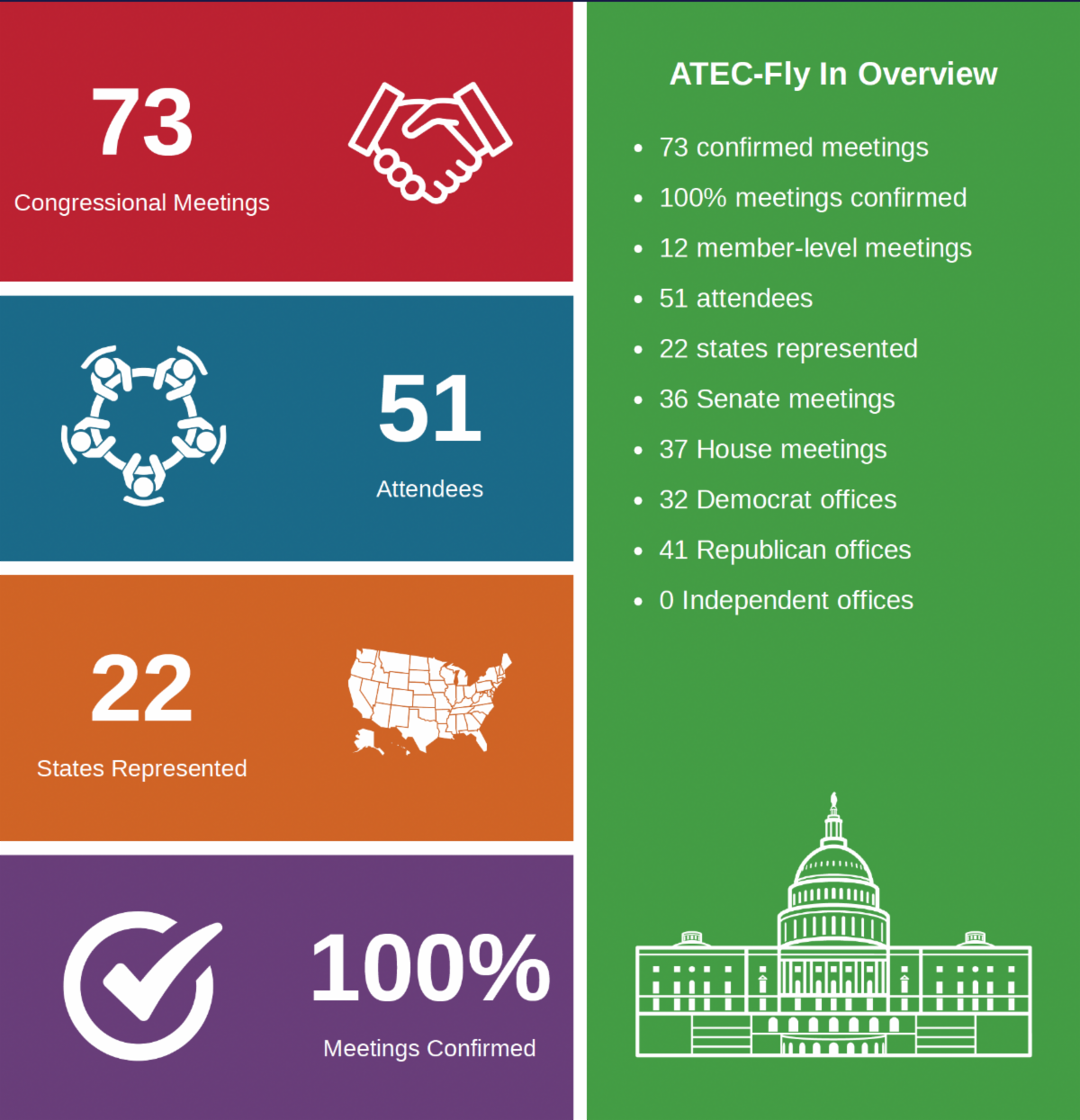 The 2025 Fly-In brought 51 attendees from 22 states to Washington, DC, for a record 73 congressional meetings—including 12 with Members of Congress themselves. These conversations, spanning both House and Senate offices, ensured our message was heard broadly across party lines.