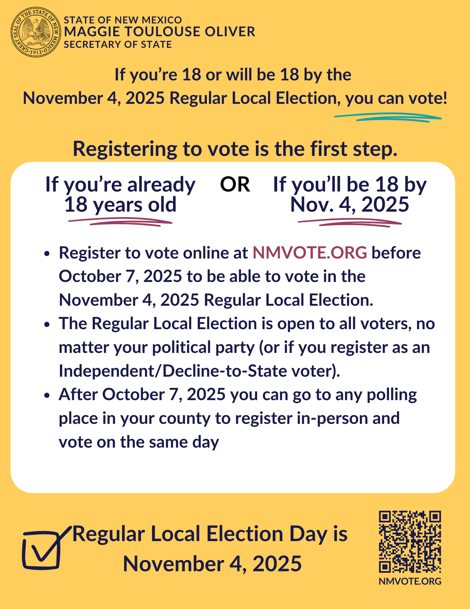 - New Mexicans can register online until October 7, 2025 for the November 4th election.