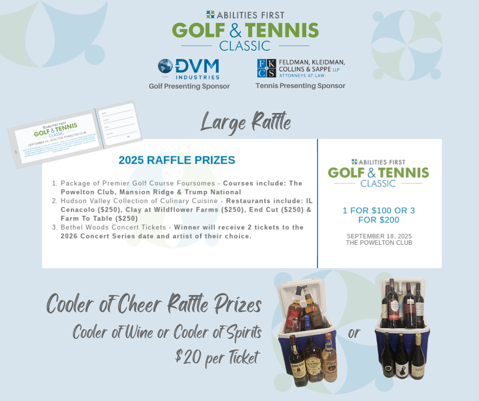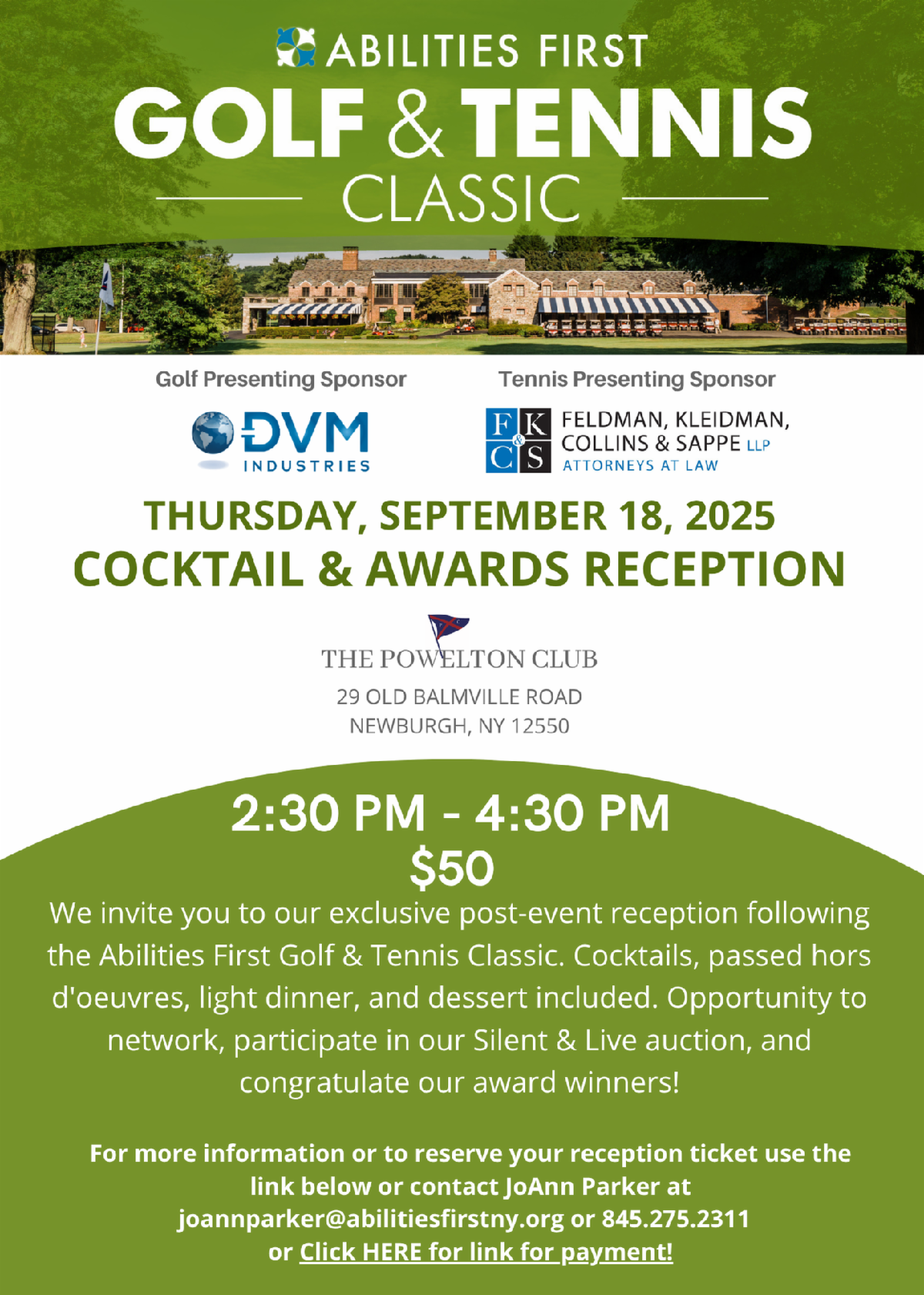 | | Abilities First & Foundation Events | | Celebrate With Us at the Golf & Tennis Classic Reception! | | Join us on Thursday, September 18, 2025 at The Powelton Club for a festive Cocktail & Awards Reception following the Abilities First Golf & Tennis Classic! Enjoy cocktails, hors d'oeuvres, a light dinner, dessert, and a chance to mingle, bid in our silent & live auctions, and celebrate our award winners. Tickets are $50—reserve yours today by clicking HERE! | | |