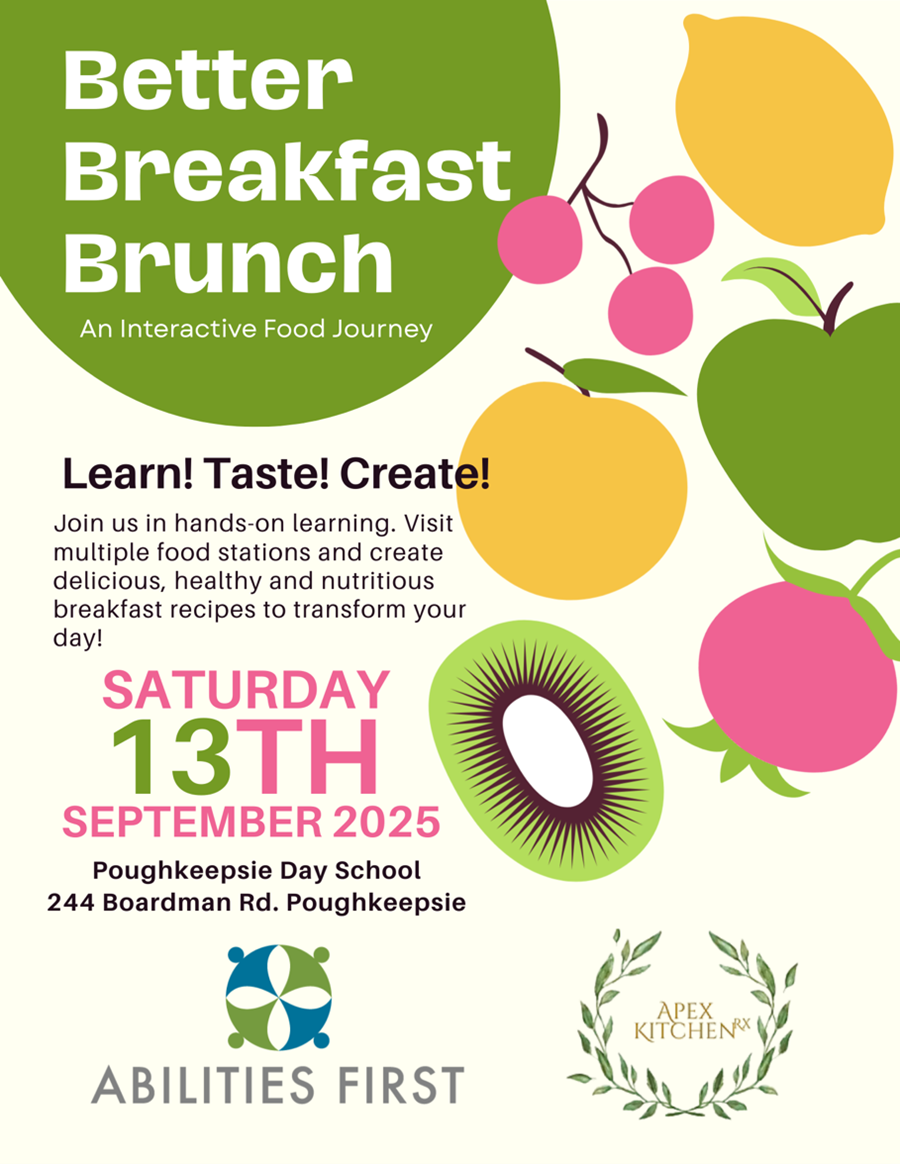 To celebrate, Abilities First is throwing a Better Breakfast Brunch open to its adult programs and adults in our sister programs in the Hudson Valley. Persons receiving services will take an interactive food journey visiting food stations to learn about healthy ways to start the day, make breakfast recipes, and taste new breakfast treats. The recipes come from the digital cookbook developed as part of the grant and will give everyone healthy and delicious alternatives to sugary breakfast cereals, but will be just as easy to make. The event is being organized by Apex Kitchens Rx and will take place at Poughkeepsie Day School.