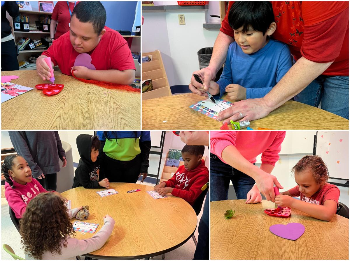 Pictured above are students at SFP participating in SEL activities. Pictured below are other sweet heart friends at Executive Drive Preschool & Day Hab Programs celebrating Valentine's Day activities!