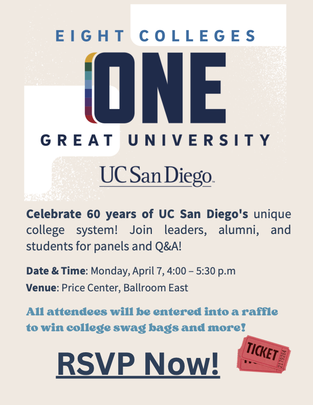 Join university leaders, undergraduate college provosts, faculty, staff, and alumni in celebrating the first 60 years of the undergraduate colleges at UC San Diego. The forum will begin with the initial group—Revelle, John Muir, and Thurgood Marshall Colleges—marking the system's establishment during its first decade, from 1964 to 1973. It will then progress to Earl Warren, Eleanor Roosevelt, and Sixth Colleges, representing the system's steady growth from 1973 to 2010. Finally, Seventh and Eighth Colleges, established as the modern-era colleges in the last decade, will be featured.