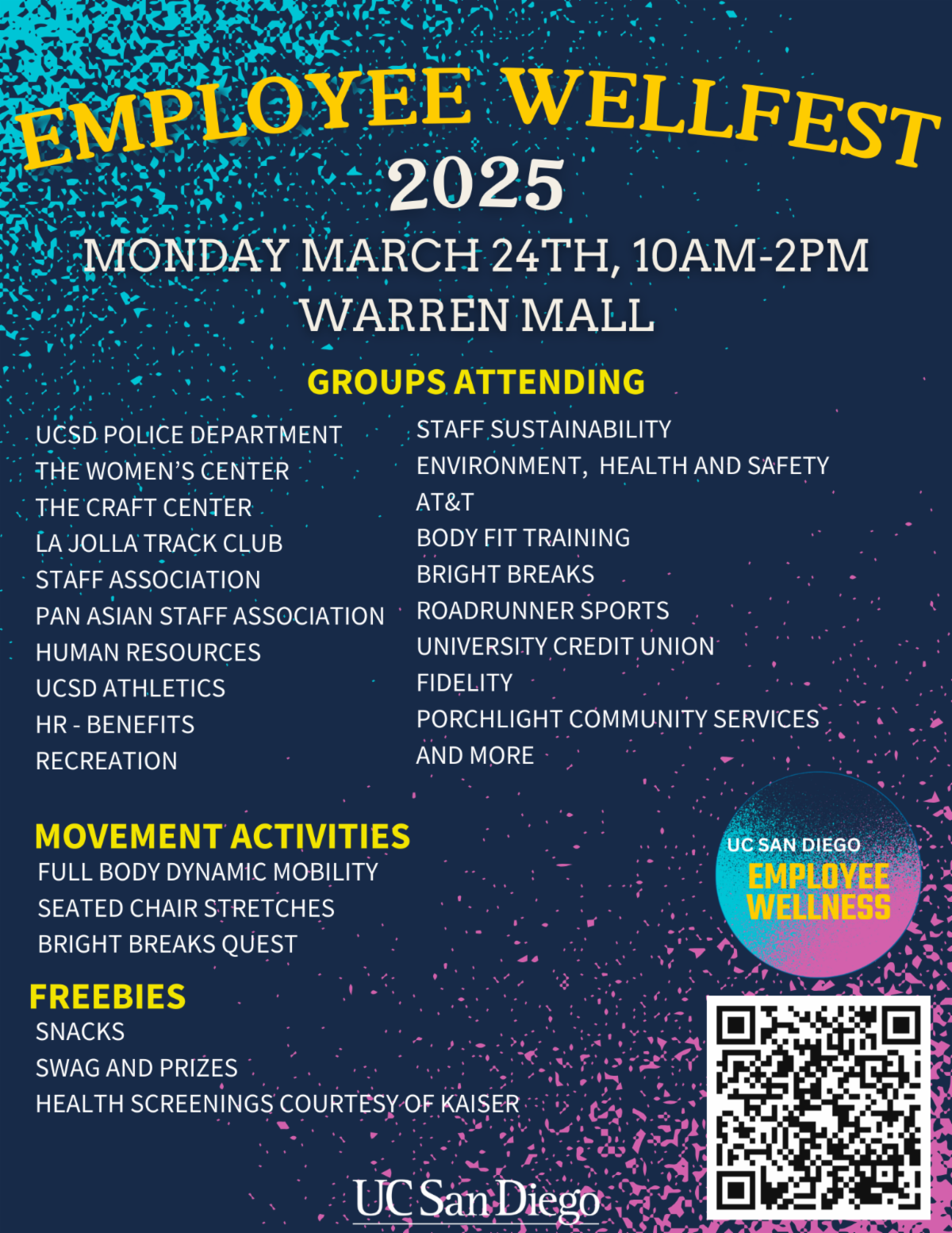 There will be many campus departments and partners in attendance, including Recreation, FSAP, HR, The Craft Center (with activities!) The Women's Center, Athletics, The Staff Association, La Jolla Track Club, Bright Breaks, Roadrunner Sports, the YMCA and more! Come by for some swag, fun, and activities!
