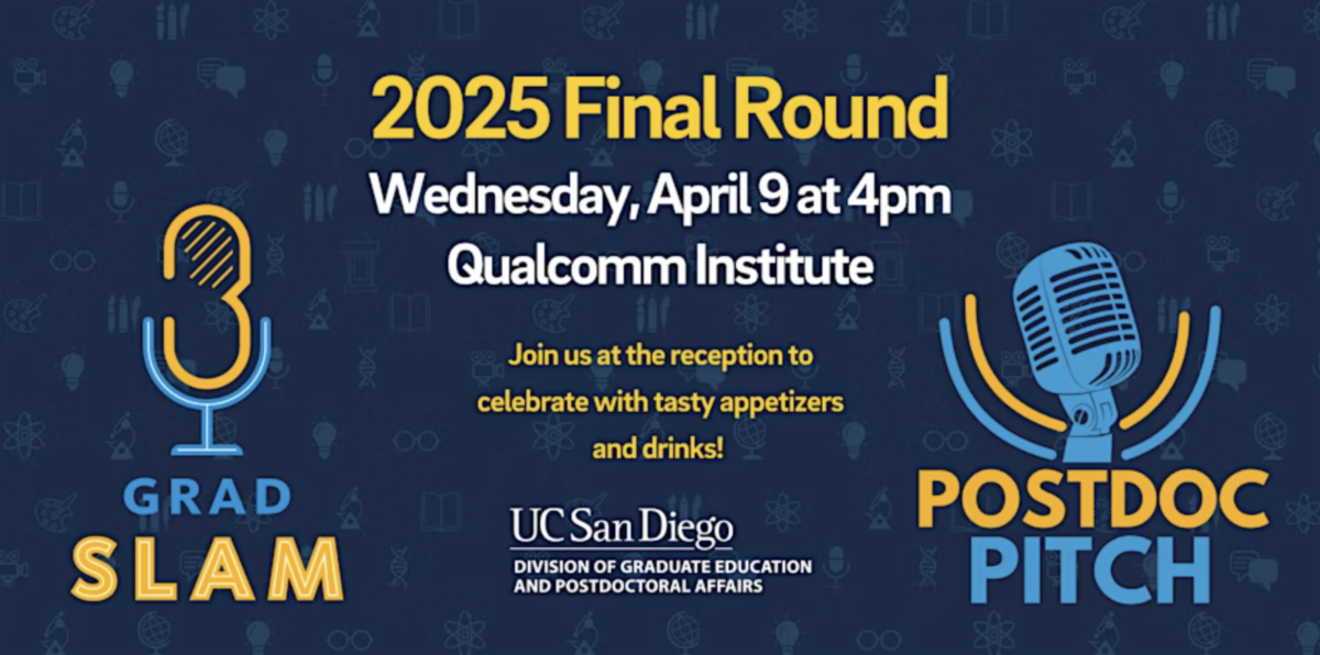 Enjoy a showcase of the top graduate student and postdoc 3-minute research talks of the year (tailored for a general audience) and learn firsthand from presenters about the potential impact of their research. Winners will take home cash prizes ranging from $500 to $5,000 and the Grad SLAM Campus Champion will then advance to the UC Systemwide Final Round on April 29.