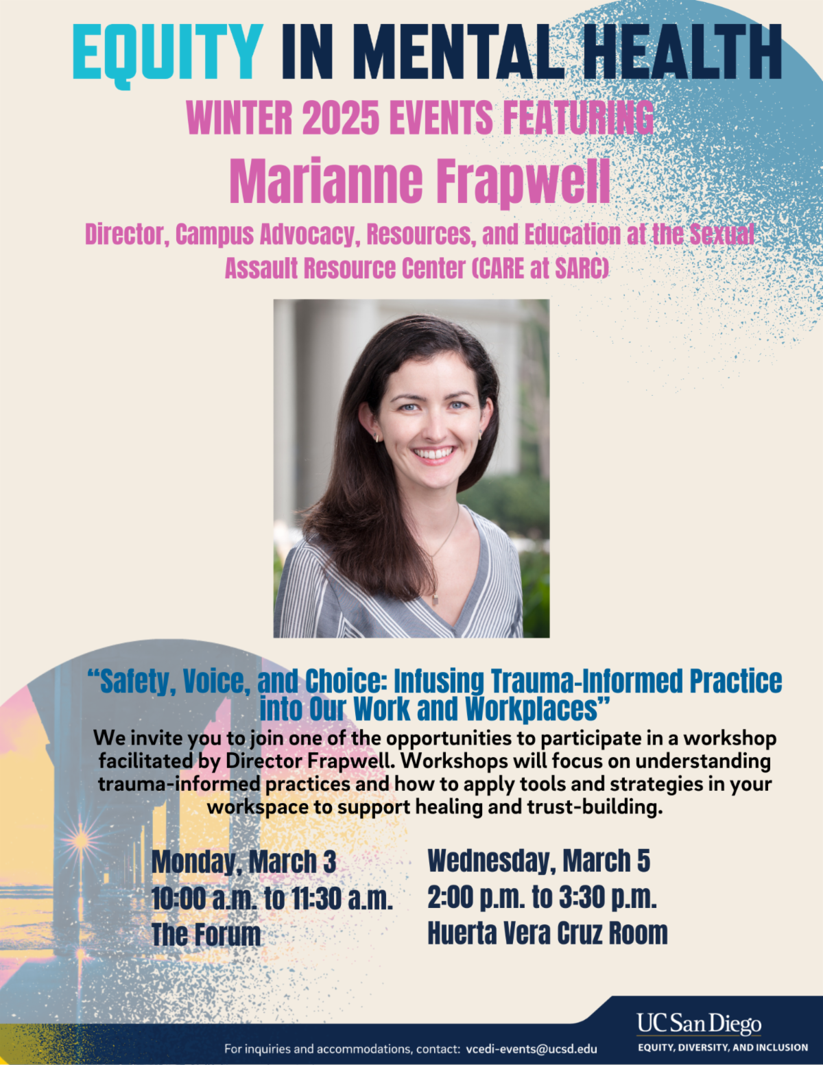 The Office of the Vice Chancellor for Equity, Diversity, and Inclusion invites you to attend a workshop facilitated by Marianne Frapwell, Director of the Campus Advocacy, Resources, and Education at the Sexual Assault Resource Center (CARE at SARC). The workshop supports learning outcomes for student-facing staff and faculty as part of the Equity in Mental Health quarterly series. Participants will gain a deeper understanding of trauma-informed practices, and the tools and strategies needed to better support UC San Diego students.