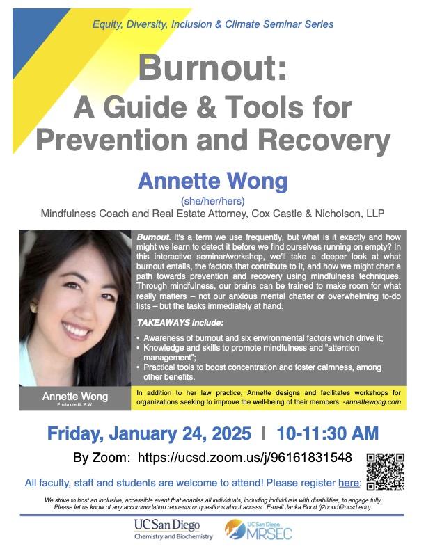 Join an interactive “Burnout” workshop by attorney and mindfulness coach Annette Wong and learn more about what burnout entails, the factors that contribute to it, and how to chart a path toward prevention and recovery using mindfulness techniques.