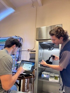 Fish in space? Out-of-this-world faculty and student research | | Sage Cohen processing spaceflight mouse brains (top), and Miguel Zyniewicz (left) and Nathan South (right) with the miniature life support system and microgravity simulator (in article). | | |