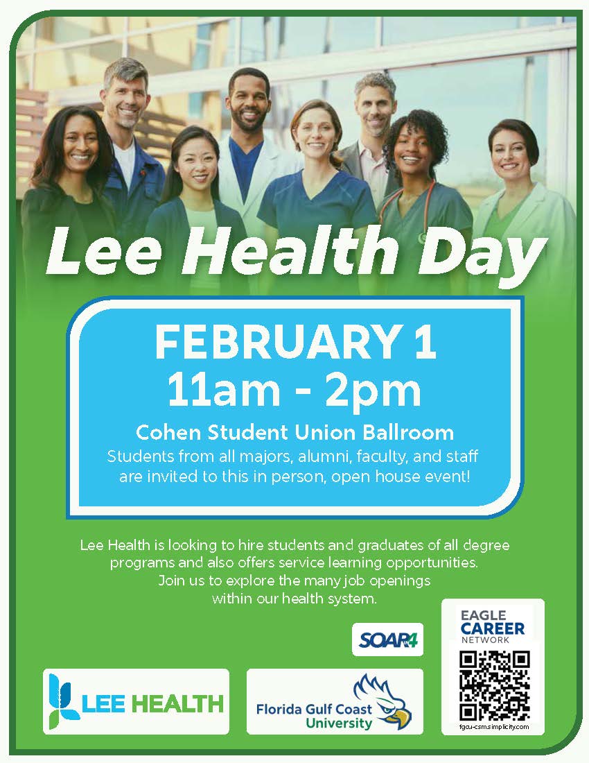 Join us to explore the many job openings within Lee Health’s system. They have opportunities for All majors in 16 departments. Students, alumni, faculty, and staff are welcome to this in-person Open House event.
