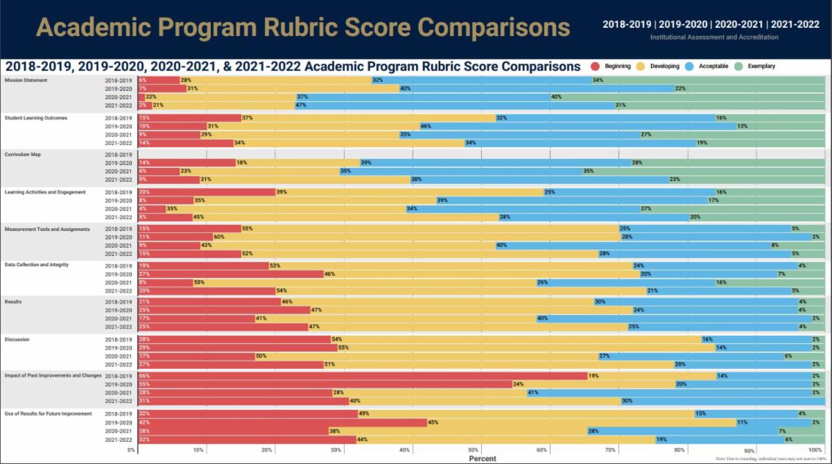 Keep this in mind as you collect and analyze data for your next assessment document. Remember, this coming fall will be the last assessment documents from the current reaffirmation cycle to be published for SACSCOC review. Let’s use this opportunity to showcase all the amazing work we are doing to enhance student learning. Last year’s round of core assessment documents was our strongest yet. Although there were some dips in the program scores, we still have come a long way since refining this process after our last decennial reaffirmation. Let’s make next year our strongest yet!