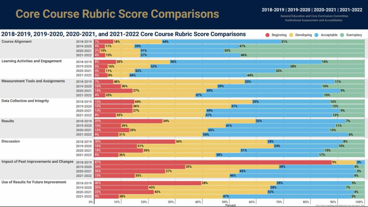 The above charts reflect the products of hard work by many across campus. From the faculty who collect the data to those who analyze the data and then write the program and core assessment documents. We also cannot forget the faculty serving on the General Education and Core Curriculum Committee (GECC) and the Academic Assessment Steering Committee (AASC) who then review and provide feedback on those documents. Assessment is truly a team effort and would not be possible without the dedication of committed faculty in every college.