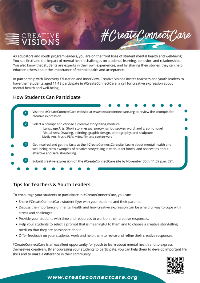 Creative Visions, Discovery Education, and InnerView have partnered to launch #CreateConnectCare, an innovative campaign that uses the power of creativity to promote mental health acceptance, connection, and support. When young people share their stories, they open up the conversation about mental health acceptance. Share this campaign with youth interested in contributing to online galleries, events, and exhibitions.