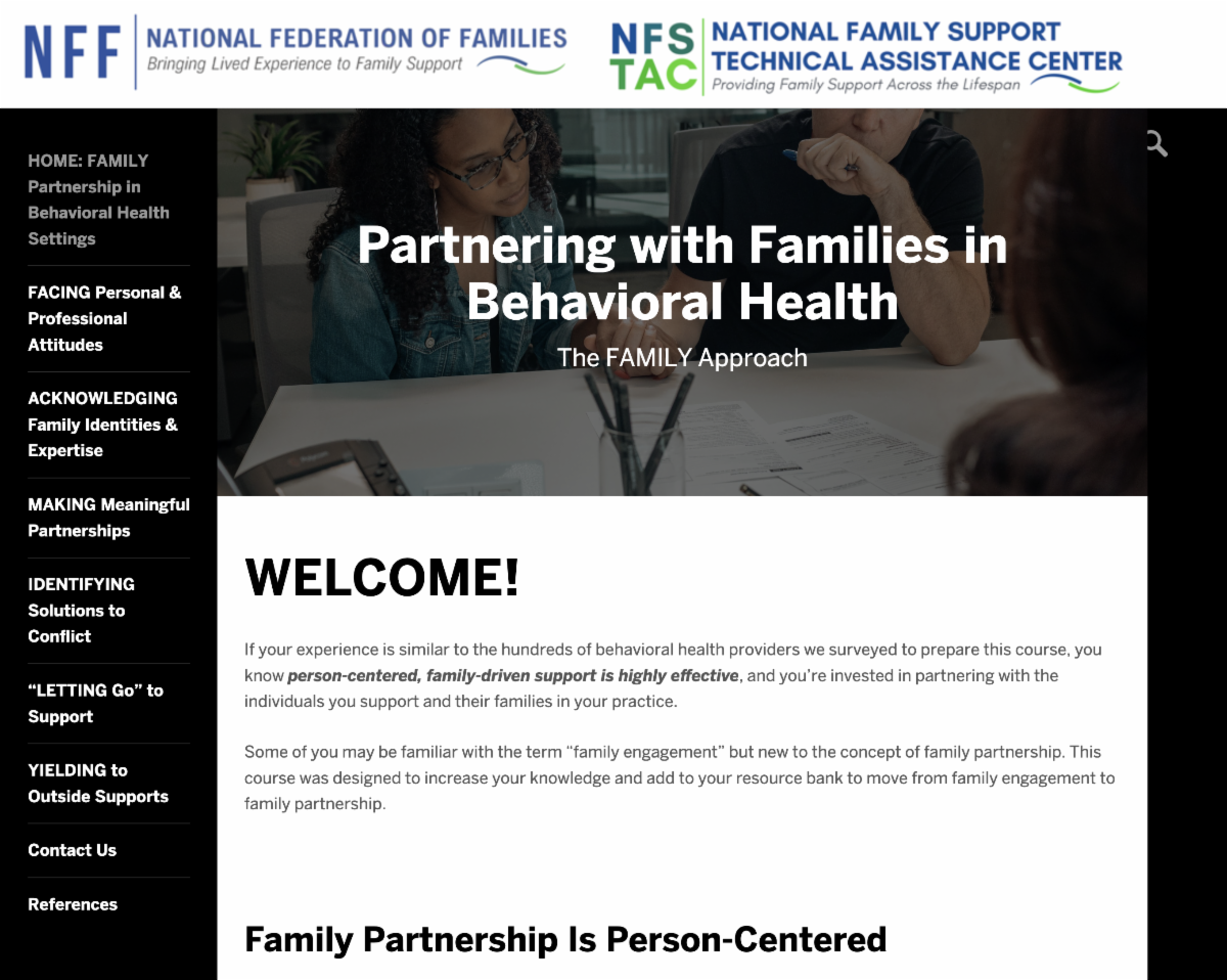 NFSTAC partnered with Boston University's Center for Psychiatric Rehabilitation to create this module to improve the behavioral health workforce's attitudes, beliefs, and practices to authentically partner with families in behavioral health care settings. From NOW until January 10, 2024, you can take a feedback survey at the end of the module to let us know how you liked it, what we can add, and whether or not you would include it in formal clinician training. Join us on January 11, 2024 for a pilot listening session from 12-1 p.m. ET to provide more feedback! | | | |