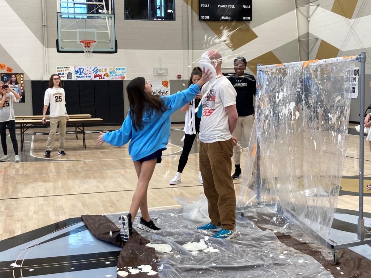 Seventh-grader Sophie Ward “pies” history teacher David Maddox during Homecoming festivities. (Photo by Acta Diurna staff)