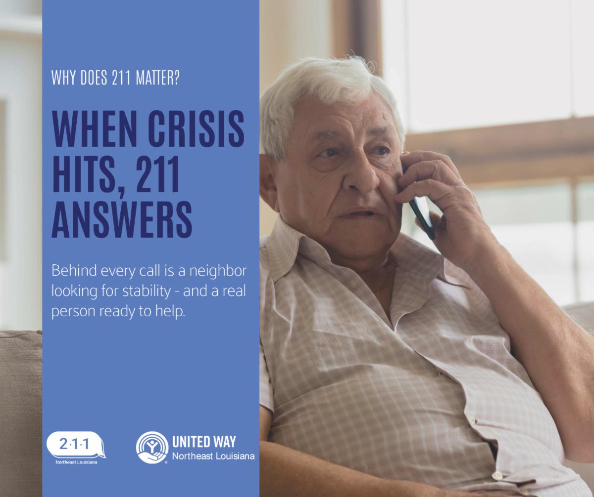 United Way of Northeast Louisiana 211 is a free, confidential service that connects people to essential resources in our community. Whether you need help with housing, food, healthcare, transportation, crisis support, or just someone to talk to, 211 is here for you—24 hours a day, 7 days a week.