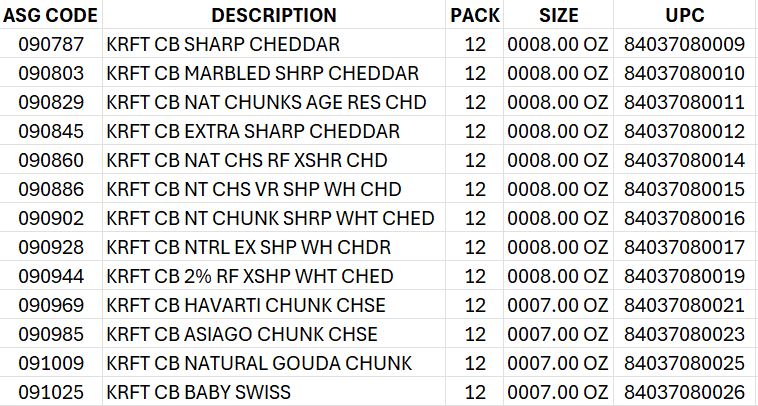 We’d like to inform you that several Cracker Barrel cheese items have undergone changes to their product codes and UPCs. Please review the updated product list below and ensure your systems are updated accordingly to maintain smooth ordering and accurate inventory tracking.