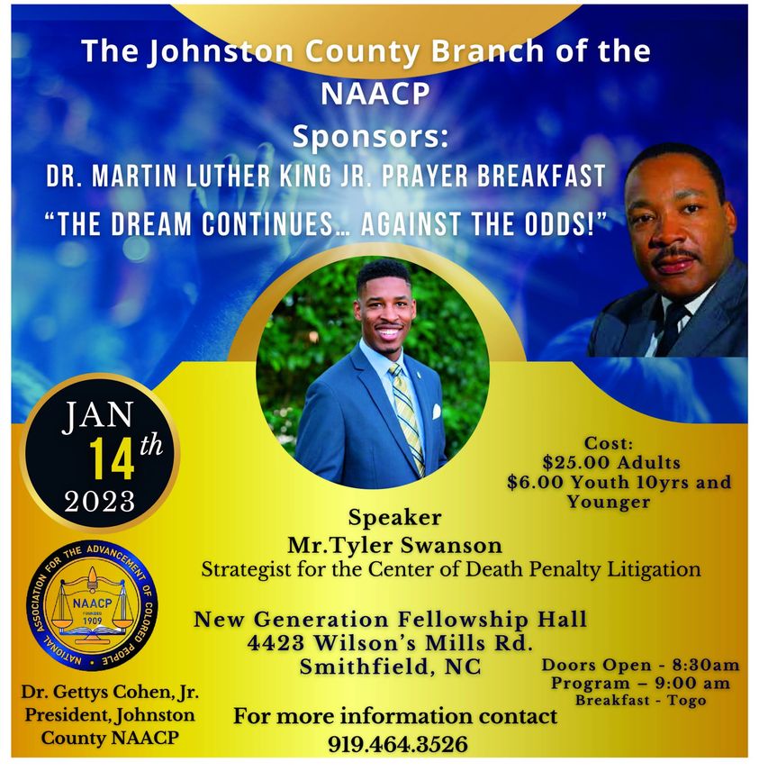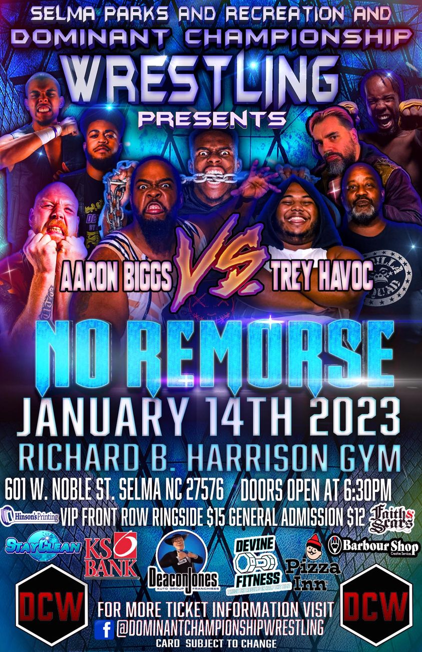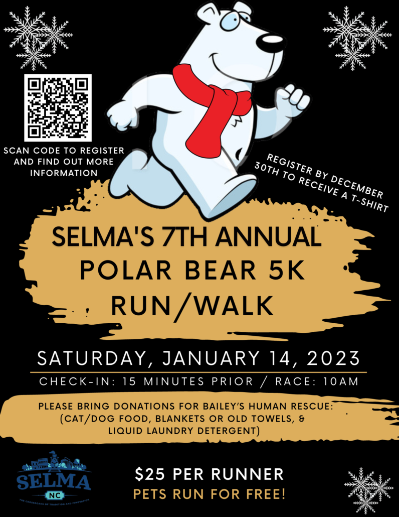 Jan 14 - 8:30 am, Dr. Martin Luther King Jr Prayer Breakfast, Smithfield (see flyer), also at 10 am, Selma's 7th Annual Polar Bear 5K Run/Walk, corner of Webb and Waddell Sts in downtown Selma. Details on the Town of Selma website. Also, at 6:30 pm, No Remorse Wrestling, Richard B Harrison Gym (see flyer); also at 7 pm, Sideline Bluegrass at The Rudy Theatre.