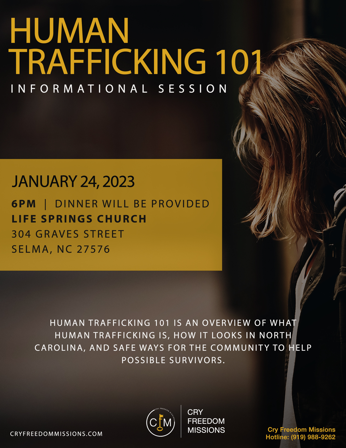 Jan 24 - 6 pm, Human Trafficking 101 Informational Session / Dinner at Life Springs Church, 301 Graves St, Selma