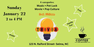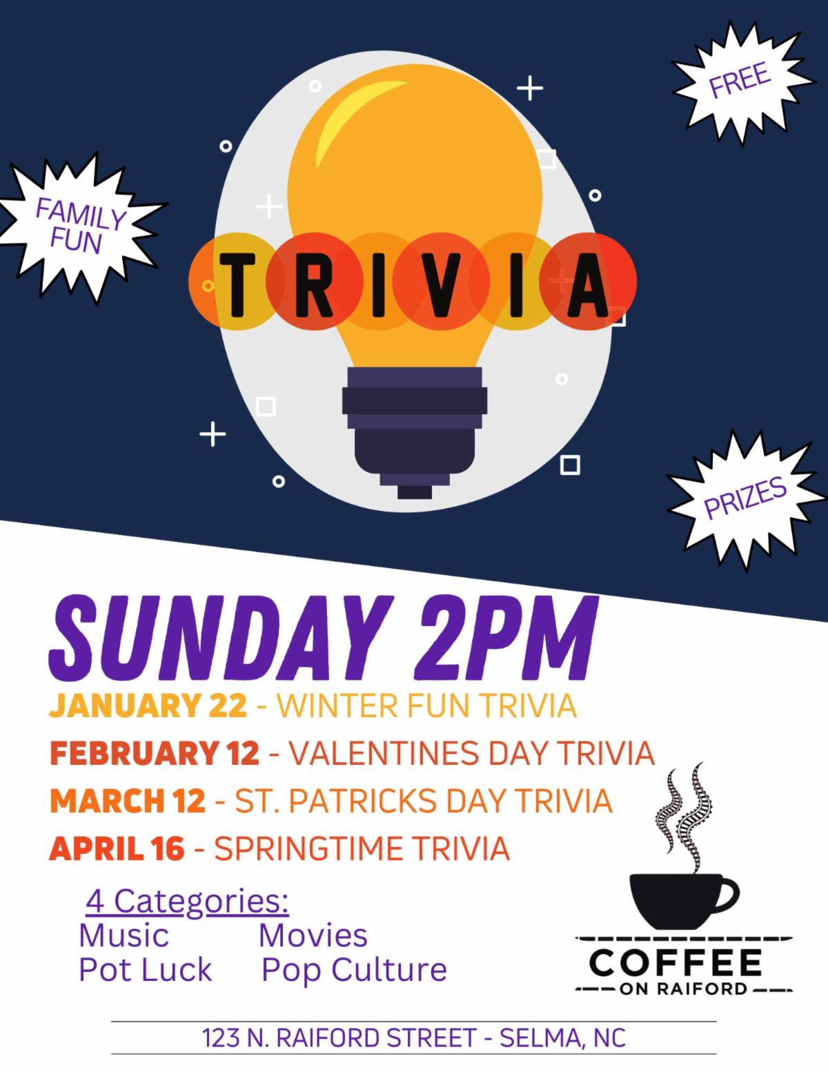 Jan 22 - 2 pm, Winter Fun Trivia at Coffee on Raiford, 123 N Raiford St.