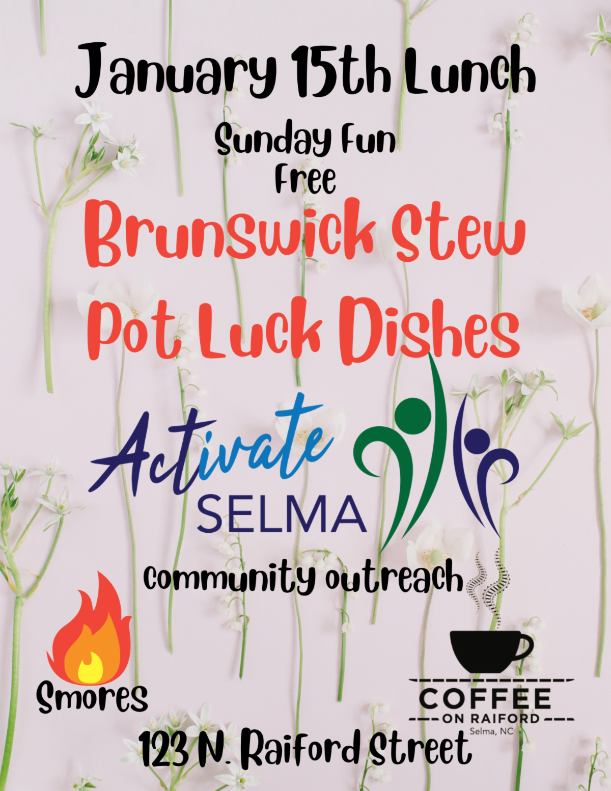 Jan 15 - afternoon, Brunswick Stew & Sunday Fun at Coffee on Raiford, 123 N Raiford St, community outreach with Activate Selma.
