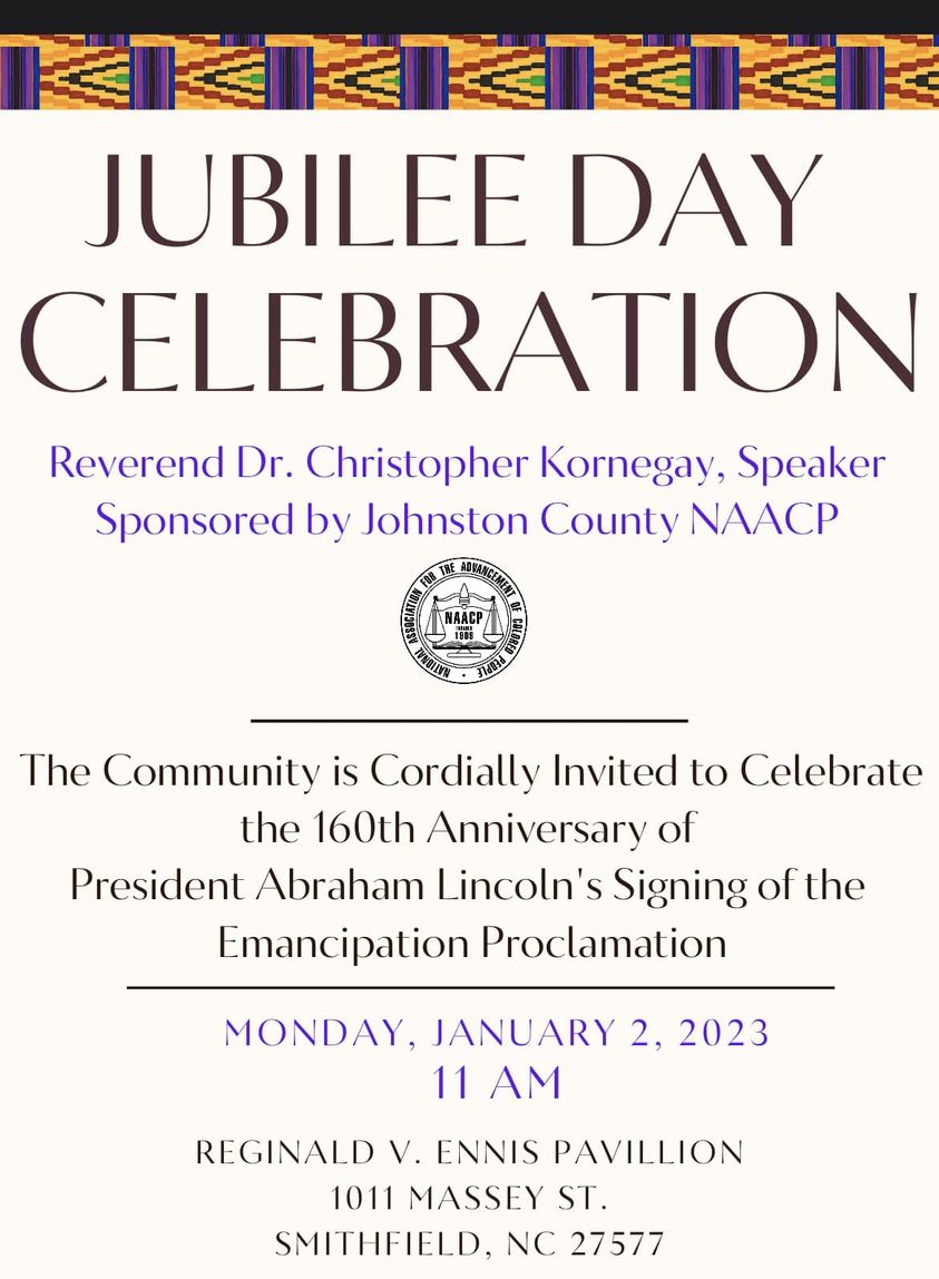 Jan 2 - 11 am, Jubilee Day Celebration, Reginald V. Ennis Pavilion, 1011 Massey St, Smithfield (see flyer)