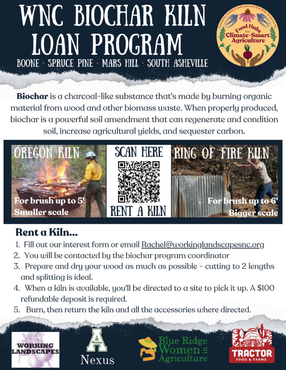 The WNC Biochar Loan Program provides FREE kilns for farmers to borrow in the Asheville, Spruce Pine and Boone regions. With so much woody debris leftover from Helene and the need to rebuild soil, biochar offers a great opportunity for farmers and we are looking forward to being able to provide more kilns to more farmers. See the attached flyer for more information and feel free to reach out to Rachel@workinglandscapesnc.org with any questions!