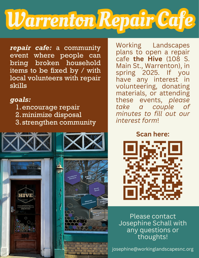 Want to help build a more creative, resourceful, and resilient community? Consider joining our forthcoming repair cafe! See flyer for more info, fill out our interest form here, and share with friends and neighbors who might be interested.