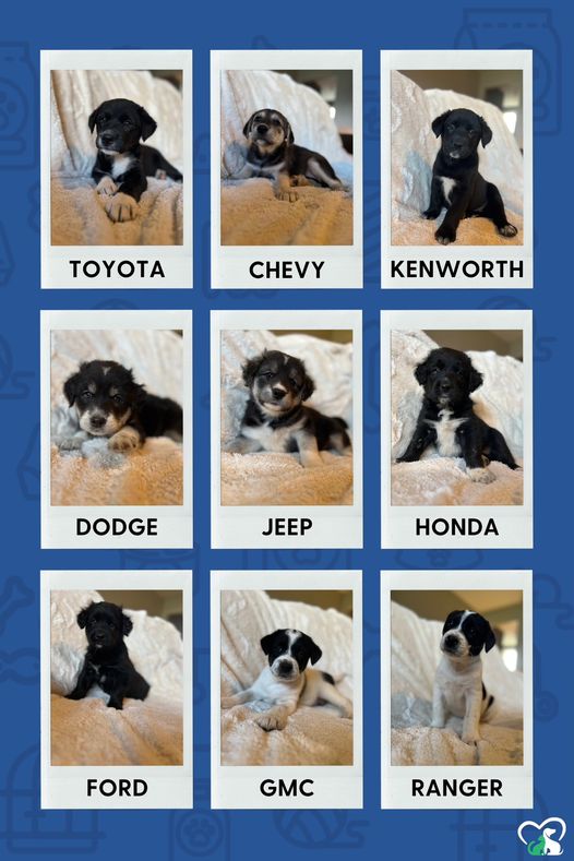 The nine puppies with car-related names are retriever mixes who are just a month old. They will be medium to large in size once fully grown. Please visit our website to find their full profiles and adoption applications.