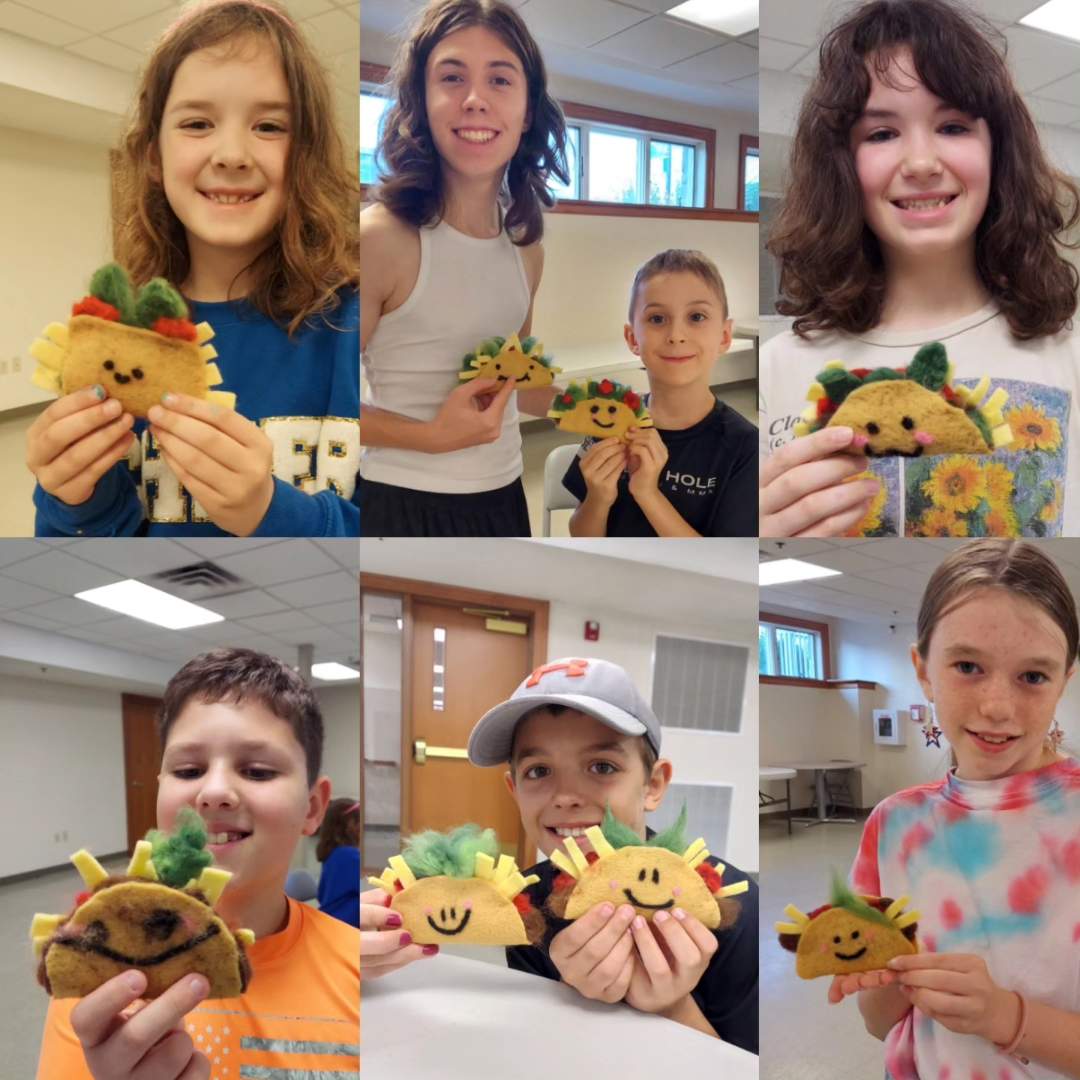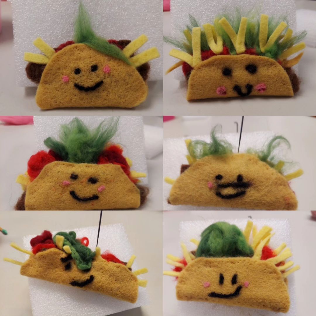 Patrons piled into the community room to take a stab at felted TACOS! Fun and Puns were spilling out of us as we pounded the brown into ground beef, cut the (felt) cheese, tossed two-toned tomatoes, and finger blended lettuce. | |